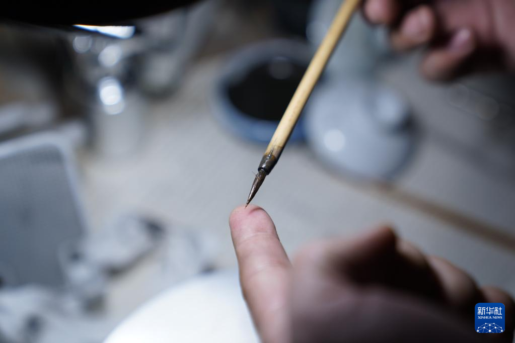曹浪展示他画青花瓷时的专用毛笔(3月11日摄)。设计一件青花瓷时,他需要用这样的毛笔在一个杯子上画几天甚至数周。