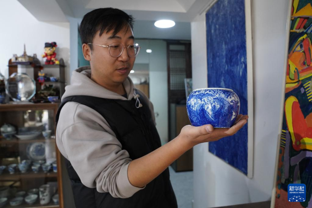 曹浪展示融入油画技法创作的青花瓷茶具(3月11日摄)。