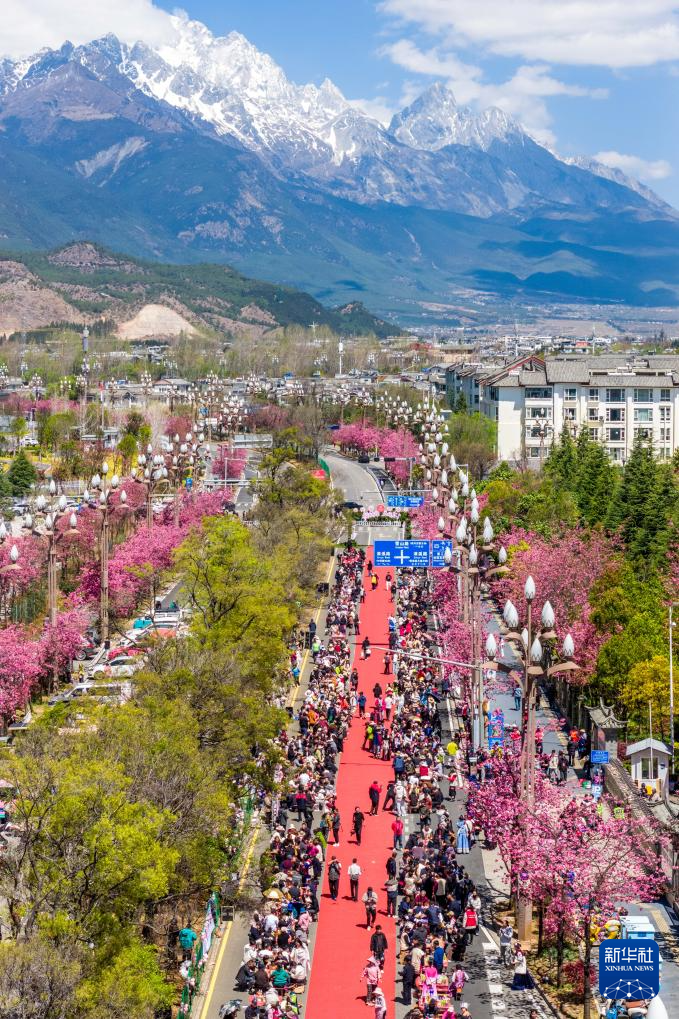 3月26日在丽江市雪山路拍摄的长街宴活动现场(无人机照片)。