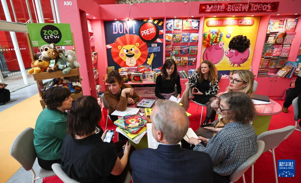 4月14日,在意大利博洛尼亚,参展商在第63届博洛尼亚国际儿童书展上交流。