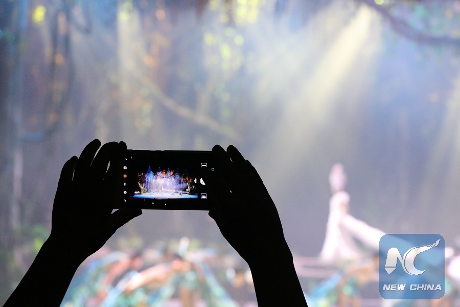 Spectator watches stage show Angkor Dynasty at a performing arts theater in Siem Ream Province, Cambodia, Oct. 25, 2017. (Xinhua/Mao Pengfei)