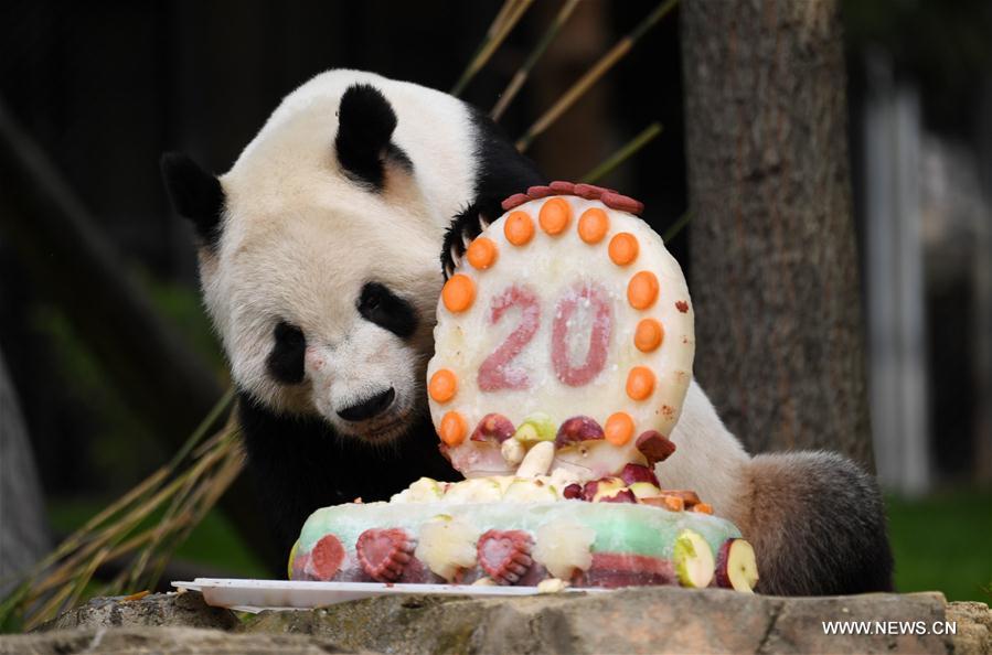 Giant panda Tian Tian enjoys birthday cake during a celebration for its 20th birthday at Smithsonian's National Zoo in Washington D.C., the United States, Aug. 27, 2017. The zoo held a celebration on Sunday for giant panda Tian Tian's 20th birthday. (Xinhua/Yin Bogu)