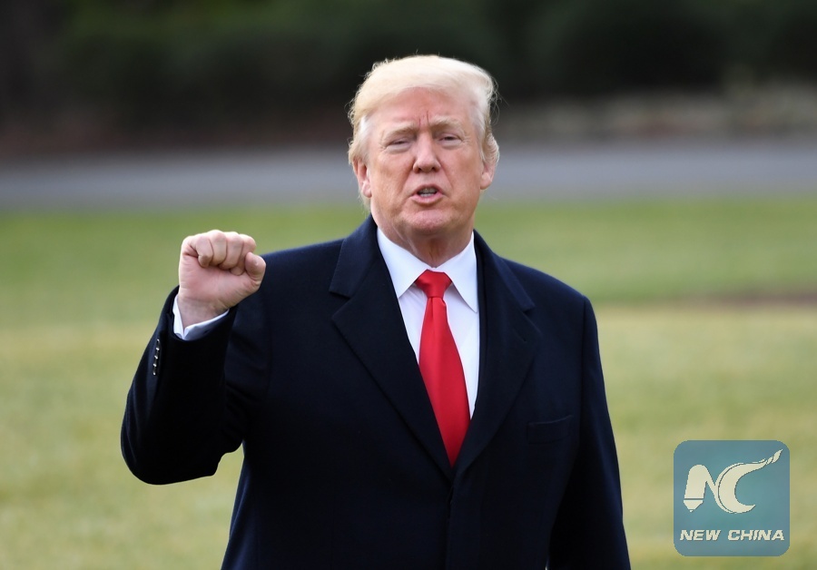 U.S. President Donald Trump responds to questions as he leaves the White House en route to Mar-a-lago Estate in Florida after signing the tax cut bill into law in Washington D.C., the United States, on Dec. 22, 2017. (Xinhua/Yin Bogu)