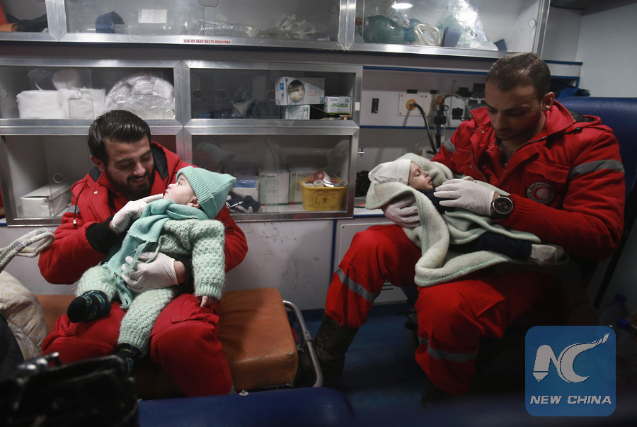 Syrian paramedics tend to children inside an ambulance on the second night of an evacuation operation led by the Syrian Red Crescent and the International Committee of the Red Cross in Douma in the eastern Ghouta region on the outskirts of the capital Damascus late on Dec. 27, 2017. (AFP photo)