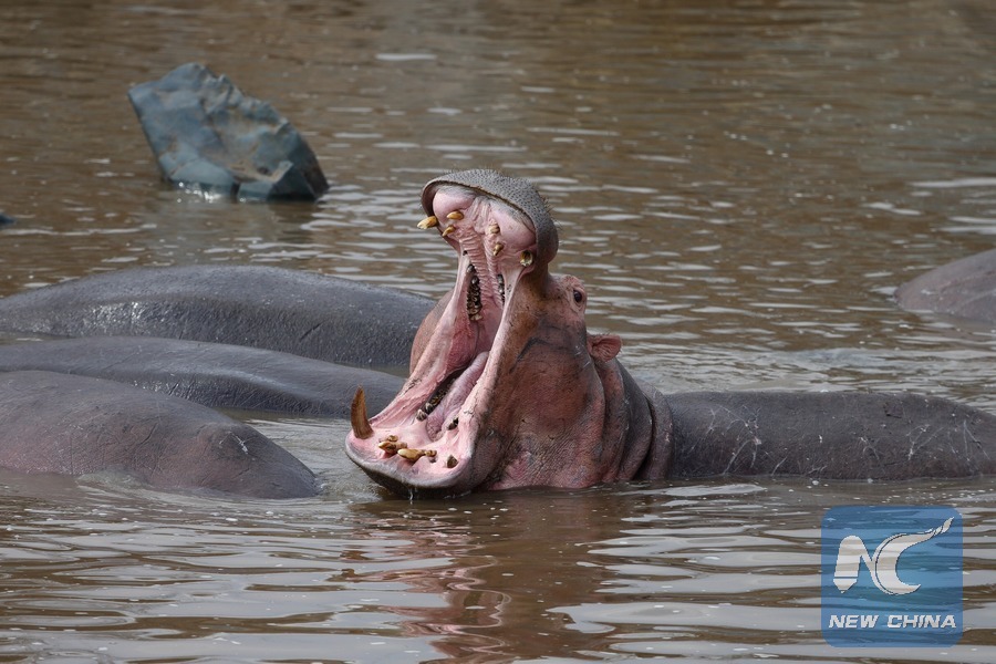 Photo taken on Aug. 16, 2013 shows a hippo yelling in the Serengeti National Park, north Tanzania. (Xinhua/Zhang Ping)