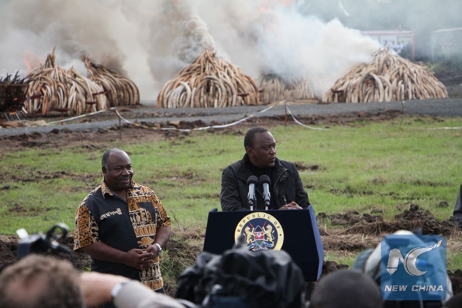 Photo shows the historic torching of ivory and rhino horns at Nairobi National Park in Nairobi, Kenya, April 30, 2016. (Xinhua/Allan Mutiso)