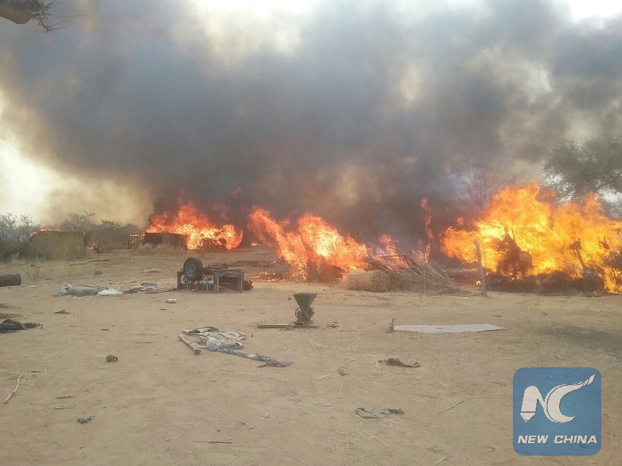File photo taken on March 16, 2016 shows burning camps during an operation in Nigeria's northeastern state of Borno. (Xinhua/Wale Salau)