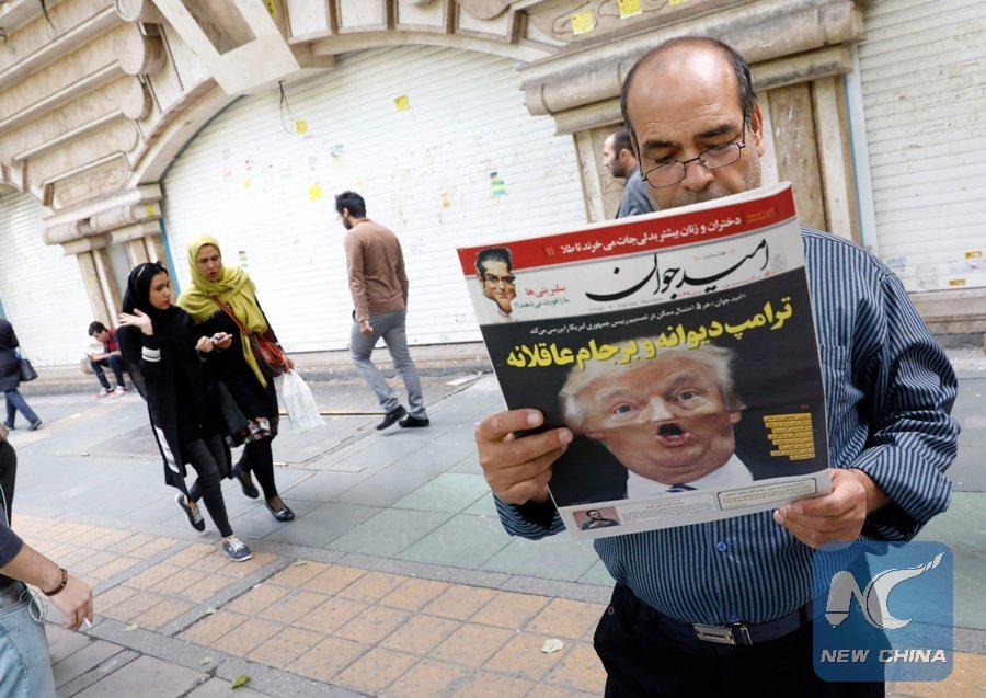 An Iranian man reads a copy of the daily newspaper 'Omid Javan' bearing a picture of U.S. President Donald Trump with a headline that reads in Persian "Crazy Trump and logical JCPOA (Joint Comprehensive Plan of Action)," on Oct. 14, 2017, in front of a kiosk in the capital Tehran. (Xinhua/AFP)