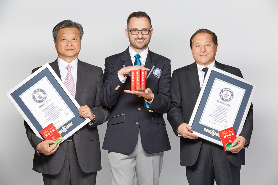 Guinness World Records SVP of Records Management and General Manager of China Office Marco Frigatti(M) presents the certificates to Xinhua Dictionary. (Photo by Guinness World Records)