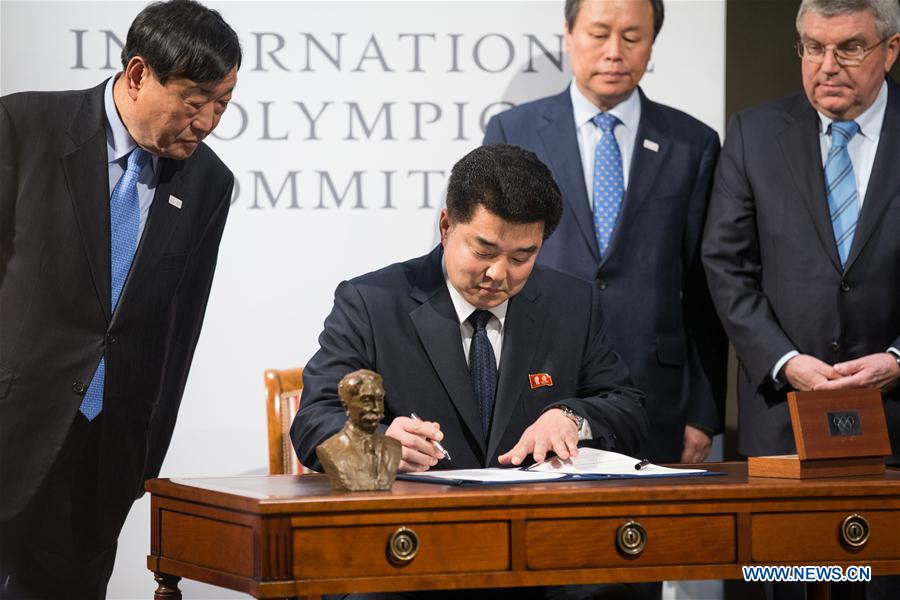 Lee Hee-beom, president of the PyeongChang Organizing Committee for the 2018 Olympic and Paralympic Winter Games (POCOG), Democratic People's Republic of Korea (DPRK)'s Olympic Committee President and Sports Minister Kim Il Guk, South Korea's Sports Minister Do Jong-hwan and International Olympic Committee (IOC) President Thomas Bach (From L to R) attend a signing ceremony after a four-party meeting at the IOC headquarter in Lausanne, Switzerland, Jan. 20, 2018. (Xinhua/Xu Jinquan)