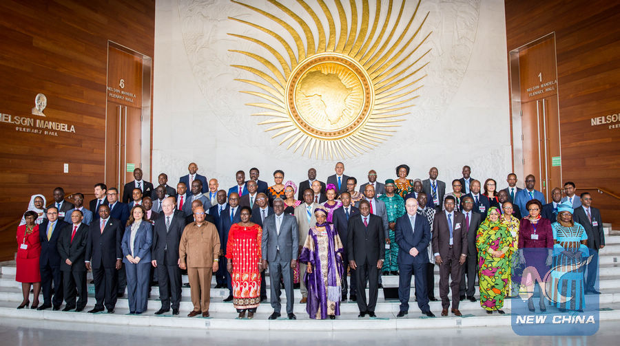 Participants pose for photo after the 35th Ordinary Session of the Permanent Representative Committee (PRC) of the African Union (AU) at the AU Headquarters in Addis Ababa, capital of Ethiopia, Jan. 22, 2018. (Xinhua/Lyu Shuai)