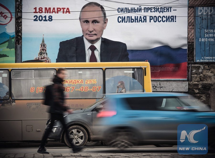 A man passes by a billboard with an image of Putin and lettering "Strong president - Strong Russia!" in Simferopol, Crimea, on January 18, 2018. (Xinhua/AFP)