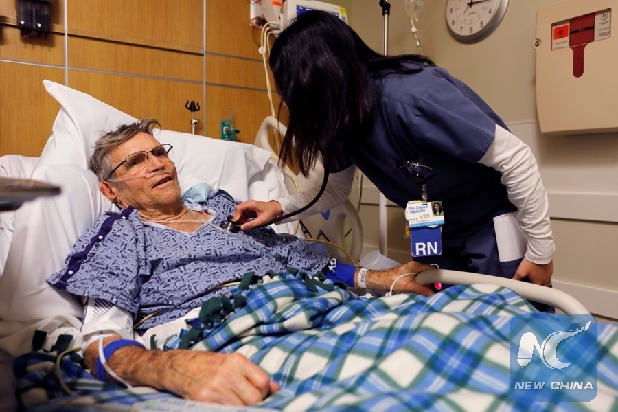 Doug Hasselo, 87 of Carlsbad, California, is treated for the flu by float nurse Nellie Reyes in the emergency room at Palomar Medical Center in Escondido, California, U.S., January 18, 2018. ( REUTERS/Mike Blake)