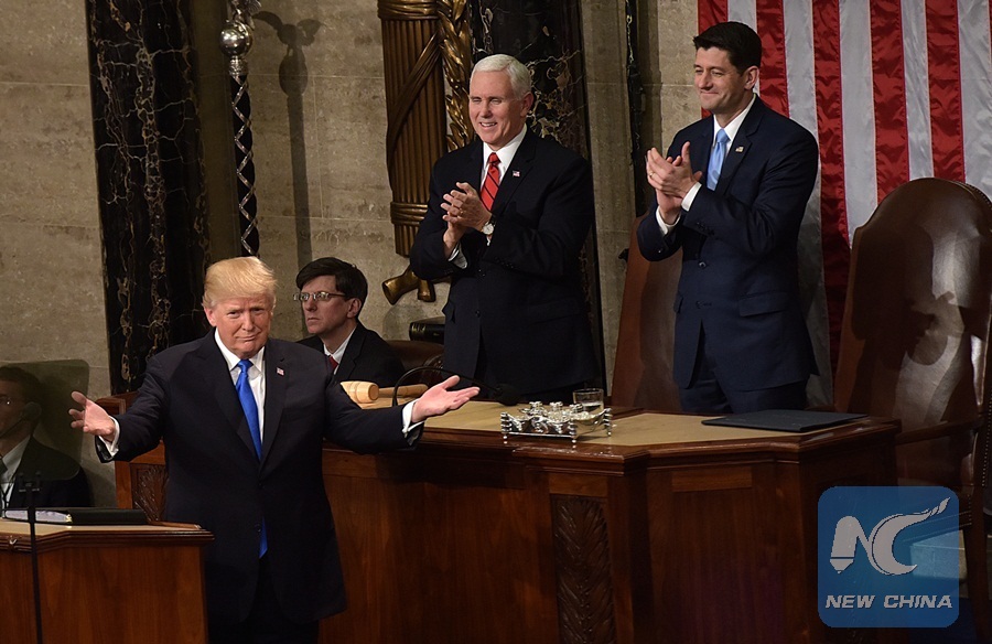 U.S. President DonaldTrump (L) delivers his State of the Union address to a joint session of Congress on Capitol Hill in Washington D.C., the United States, Jan. 30, 2018. (Xinhua/Yin Bogu)