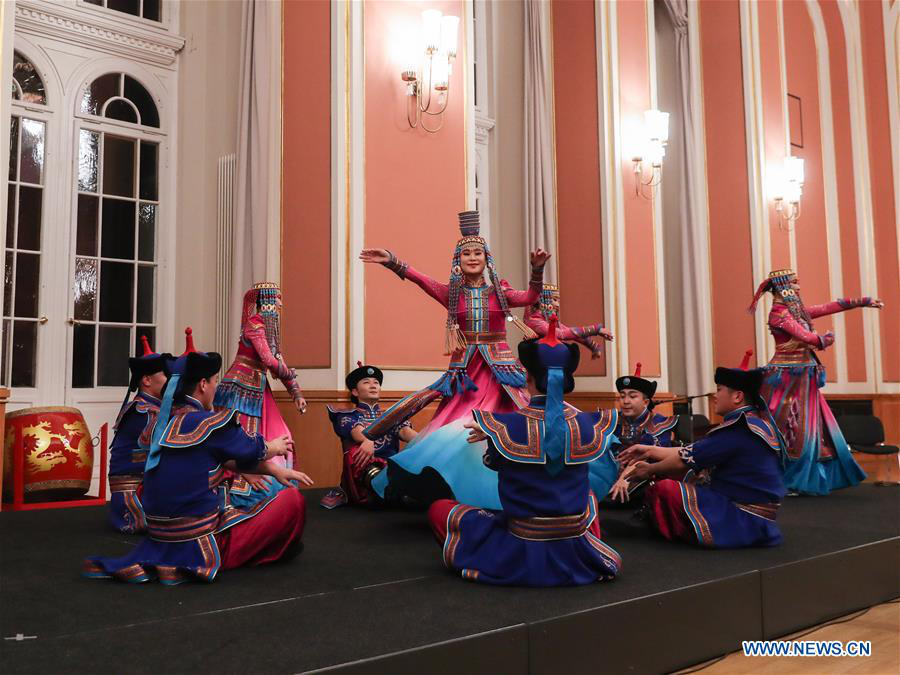 Dancers from Chinese Inner Mongolia Autonomous Region perform during the "Happy Chinese New Year" gala at the Red City Hall in Berlin, capital of Germany, on Feb. 5, 2018. (Xinhua/Shan Yuqi)