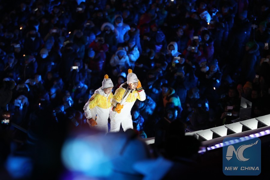 Torchbearer Jung Su-hyon (L) of the Democratic People's Republic of Korea (DPRK) and Park Jongah of South Korea hold the Olympic torch during the opening ceremony of the 2018 PyeongChang Winter Olympic Games at PyeongChang Olympic Stadium in PyeongChang, South Korea, Feb. 9, 2018. (Xinhua/Bai Xuefei)