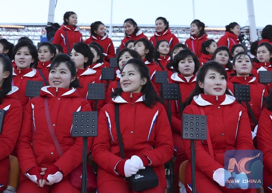 Cheerleaders from the Democratic People's Republic of Korea (DPRK) are seated ahead of the opening ceremony of the 2018 PyeongChang Winter Olympic Games at PyeongChang Olympic Stadium in PyeongChang, South Korea, Feb. 9, 2018. (Xinhua/Bai Xuefei)