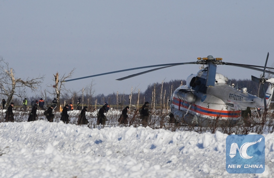 Russian Emergencies Ministry officers work at the scene where the AN-148 passenger jet crashed on Feb. 11 in the Moscow region of Russia on Feb. 12, 2018. (Xinhua/Sputnik)