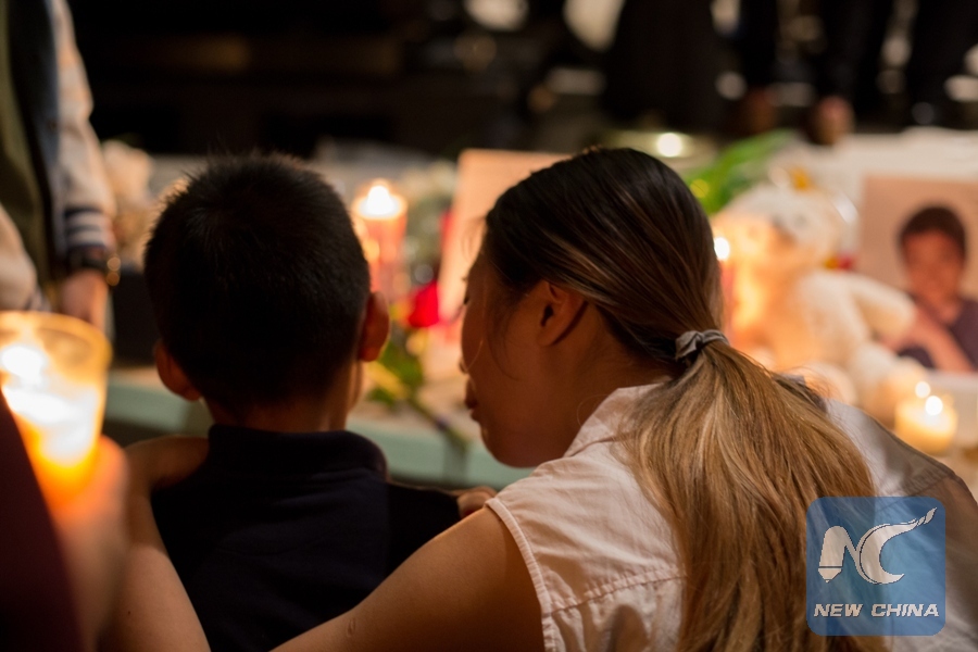 Family members of Peter Wang, a Chinese American victim, attend a vigil for the victims of the shooting at Marjory Stoneman Douglas High School, in Pine Trails Park in Parkland, Florida, the United States, on Feb. 15, 2018. (Xinhua/Monica McGivern)