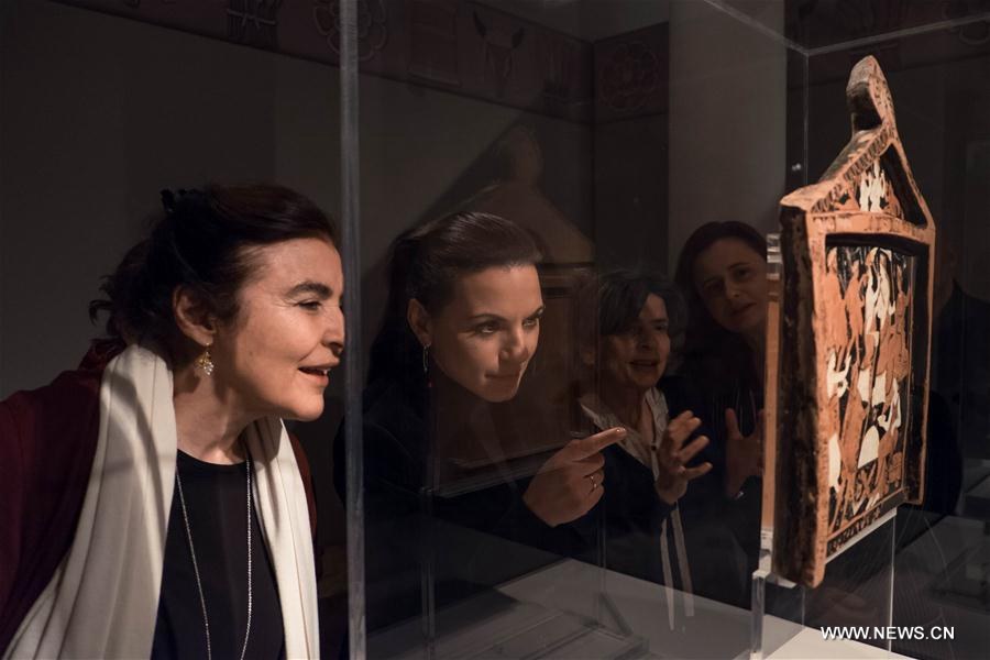 Greek Minister of Culture Lydia Koniordou (1st L) visits the temporary exhibition "Eleusis, The great mysteries" at the Acropolis Museum in Athens, Greece, on Feb. 25, 2018. A new temporary exhibition dedicated to the Elefsinian Mysteries opened at the Acropolis Museum in the Greek capital on Monday, taking visitors to a journey back to one of the most important religious sites of ancient Greece which remained a secret through the centuries. (Xinhua/Lefteris Partsalis)