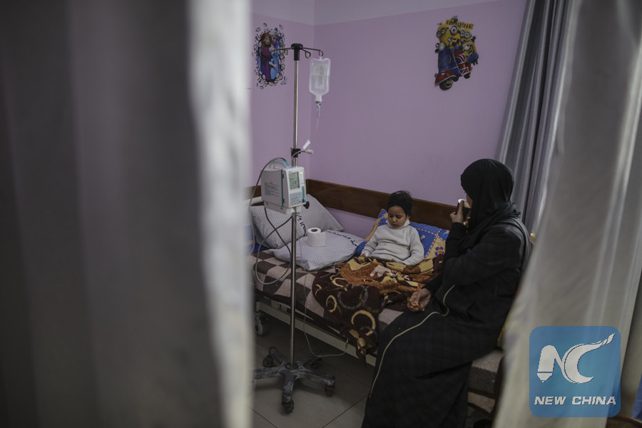 GAZA, March 1 (Xinhua) -- Ibtisam Atteyeh, a 32-year-old mother, sat sleepless with sadness close to the bed of her 8-year-old son Fadi, who has been treated in al-Rantisi Cancer Hospital in northern Gaza City for two months, to make sure that he is still breathing.