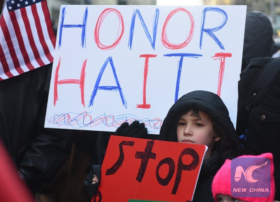Protesters carry signs during a march on Martin Luther King Jr. Day in Times Square, called Rally Against Racism: Stand Up for Haiti and Africa in New York Jan. 15, 2018. Americans remembered civil rights hero Martin Luther King on his holiday Monday, a day after U.S. President Donald Trump vehemently denied he is a racist amid an uproar over a reported presidential slur. (Xinhua/AFP)