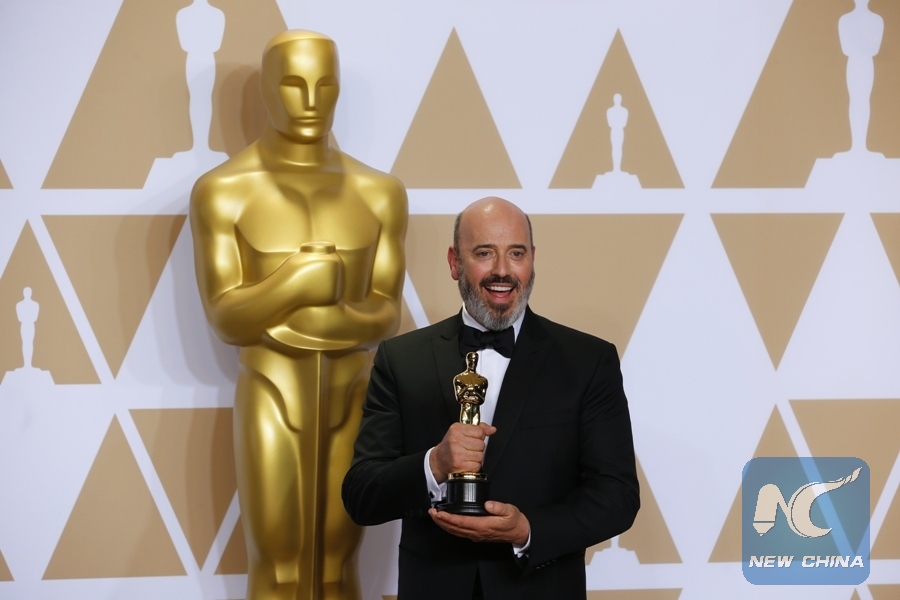 Mark Bridges poses after winning the Best Costume Design award for "Phantom Thread" at press room of the 90th Academy Awards at the Dolby Theater in Los Angeles, the United States, on March 4, 2018. (Xinhua/Li Ying)