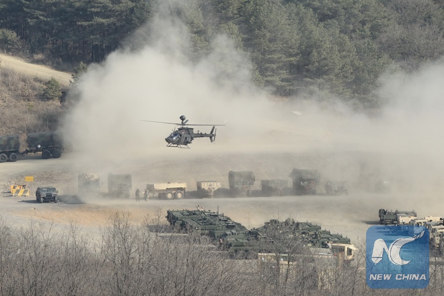 An armored helicopter prepare to land on the ground during the annual joint military exercise Foal Eagle between South Korea and the United States in Pocheon, northeast of Seoul, March 25, 2015. (Xinhua/Seongbin Kang)