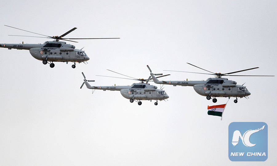 Indian Air Force Mi-17 helicopters fly past during Exercise Iron Fist on March 18, 2016. (AFP PHOTO)