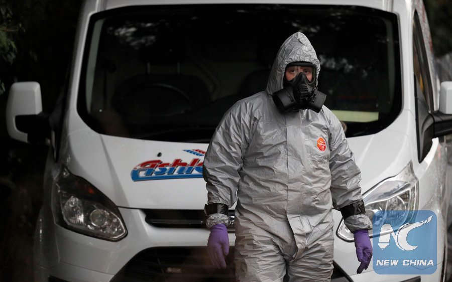 Military personnel wearing protective coveralls work to remove a vehicle as part of the ongoing investigation in connection with the major incident sparked after a man and a woman were apparently poisoned in a nerve agent attack on March 12, 2018 near Middle Winterslow. (Xinhua/AFP)