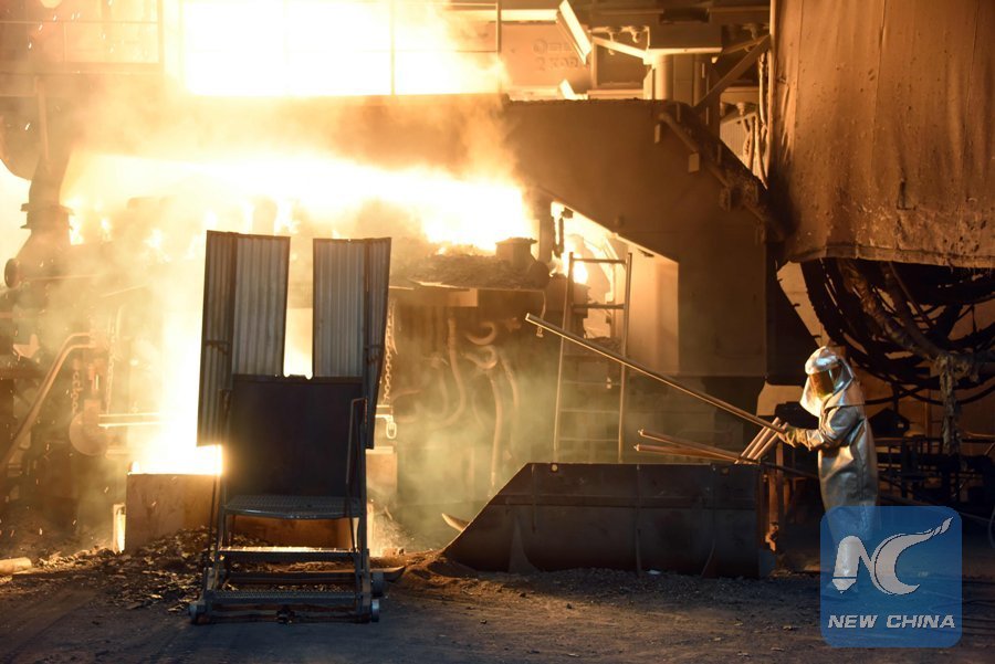 A steelworker in a protective suit checks the temperature of molten metal in furnace at the TMK Ipsco Koppel plant in Koppel, Pennsylvania on March 9, 2018. (Xinhua/AFP)