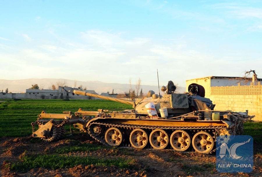 A Syrian tank aims at rebel positions in the town of Jisreen in the capital Damascus' Eastern Ghouta countryside on March 14, 2018. In the capital Damascus, the Syrian army continued its military offensive against the rebels in Eastern Ghouta, capturing new areas on Wednesday while securing the evacuation of civilians from areas in Eastern Ghouta. (Xinhua/Ammar Safarjalani)
