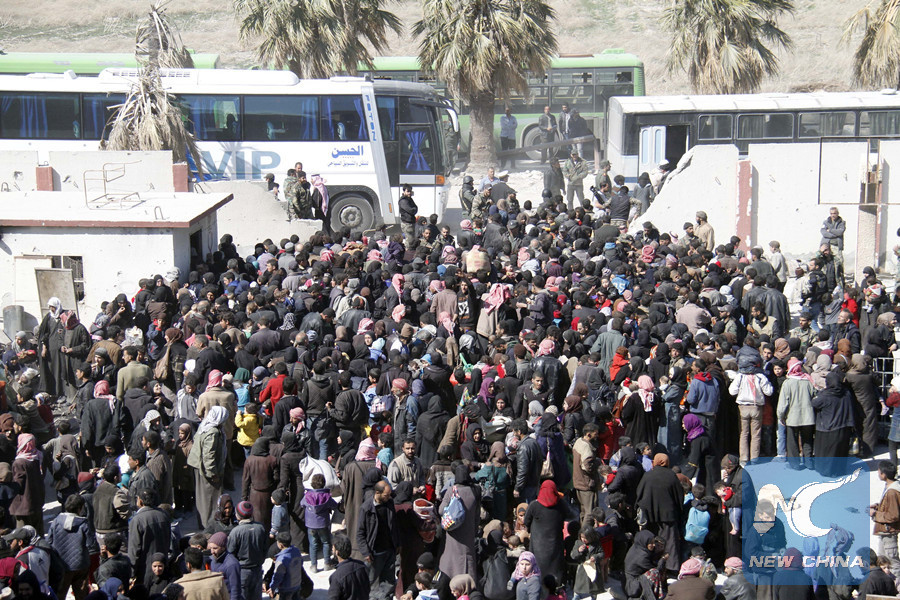 People gather to be transferred from a temporary shelter in the Housh Nasri area, east of Damascus, capital of Syria, to better shelters near Damascus, on March 16, 2018. (Xinhua/Hummam Sheikh Ali)