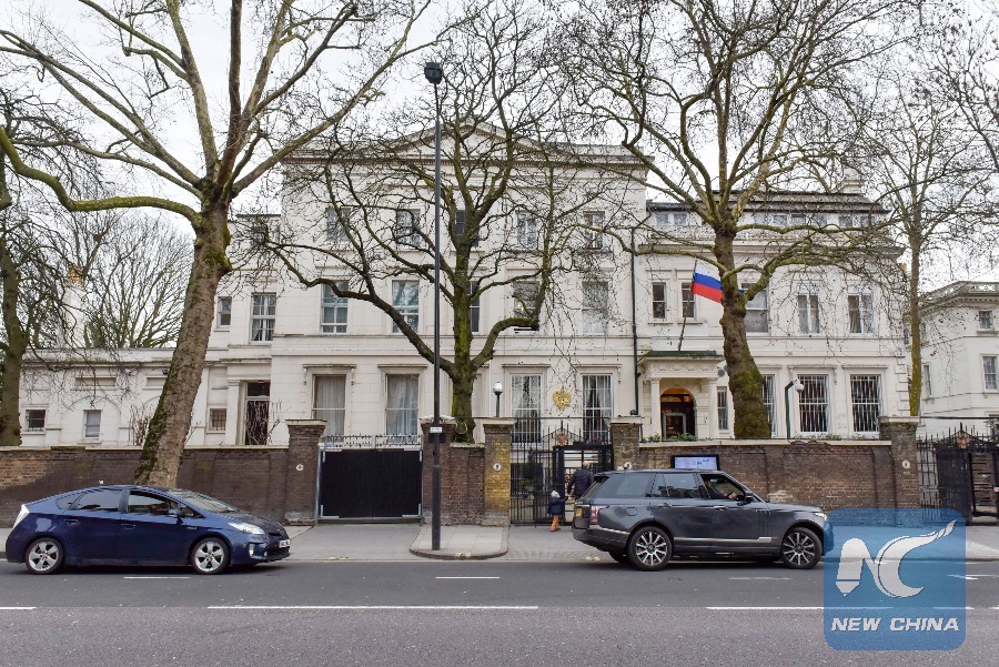 Photo taken on March 14, 2018 shows a general view of the exterior of the Russian Embassy in London, Britain. British Prime Minister Theresa May on Wednesday announced a series of measures against Russia over a recent attack on former Russian spy Sergei Skripal and his daughter. (Xinhua/ Stephen Chung)