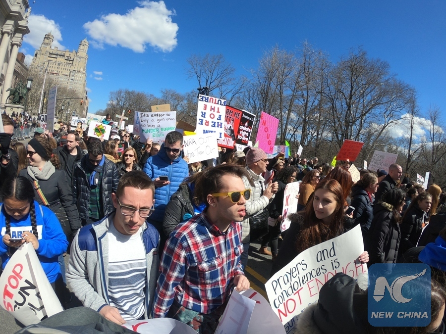 NEW YORK, March 24 (Xinhua) -- Braving the chilly weather on Saturday morning, thousands of teenagers,teachers and parents in New York took to the streets in their support for a nationwide students march calling the U.S. Congress to pass tighter gun-control laws.