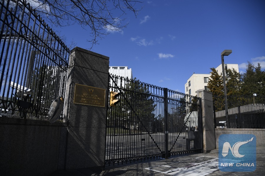 Photo taken on March 26, 2018 shows the gate of Embassy of Russia in Washington D.C., the United States. U.S. President Donald Trump has ordered the expulsion of 60 Russian diplomats and intelligence officials, and the closure of the Russian Consulate in Seattle in response to the poisoning of a Russian ex-spy in Britain earlier this month. (Xinhua/Yang Chenglin)
