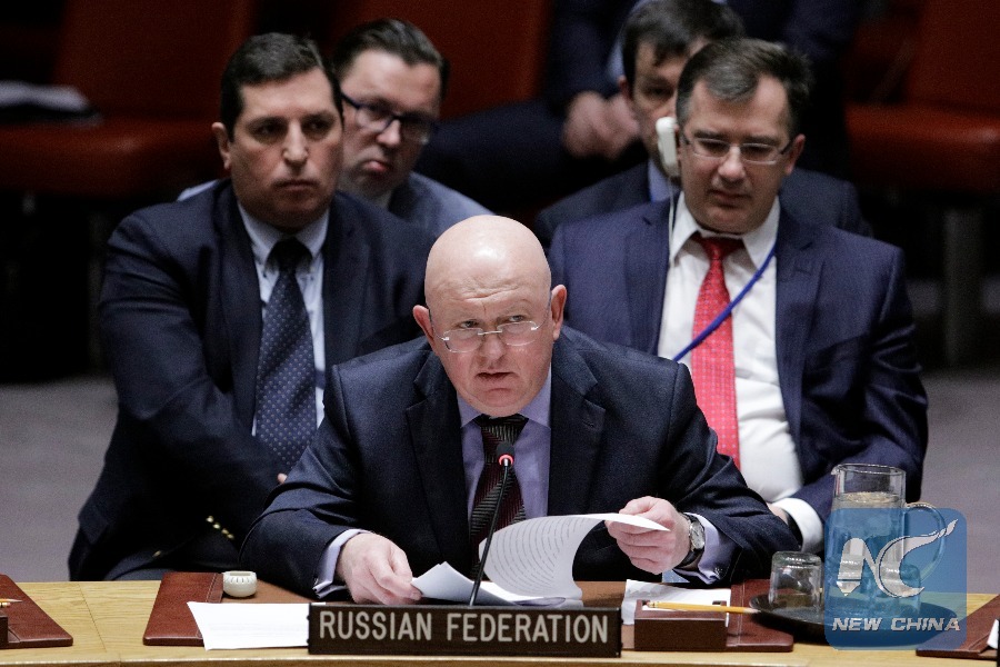 Russian Ambassador to the United Nations Vassily Nebenzia (Front) addresses a Security Council emergency meeting regarding accusations of the use of a nerve agent in the United Kingdom at the United Nations headquarters in New York, on March 14, 2018. (Xinhua/Li Muzi)