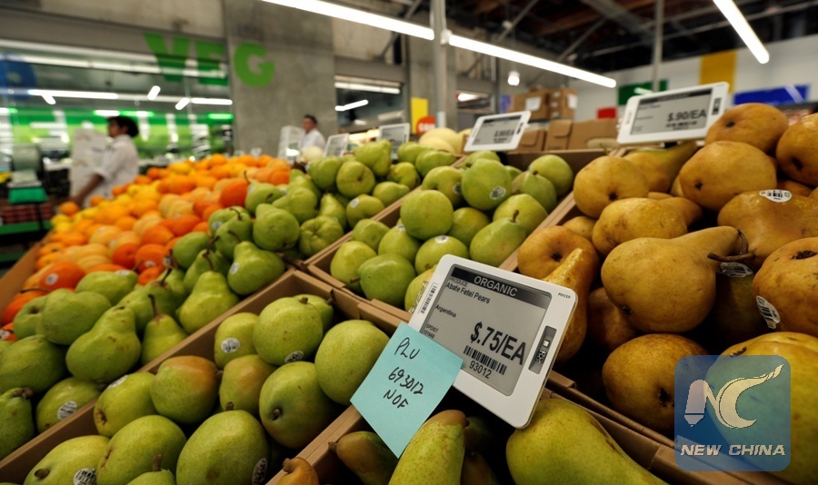 Prices of pears are displayed on digital price tags at a 365 by Whole Foods Market grocery store ahead of its opening day in Los Angeles, U.S., May 24, 2016. (Xinhua/REUTERS)