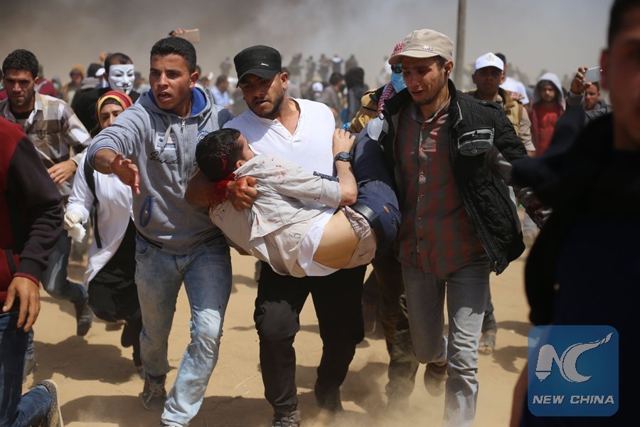 Palestinian protesters carry an injured man during clashes on the Gaza-Israel border, east of GazaCity on April 6, 2018. (Xinhua/Khaled Omar)