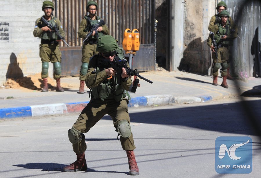 Israeli soldiers take positions during a clash with Palestinian protesters in the West Bank city of Hebron, on March 31, 2018. (Xinhua/Mamoun Wazwaz)
