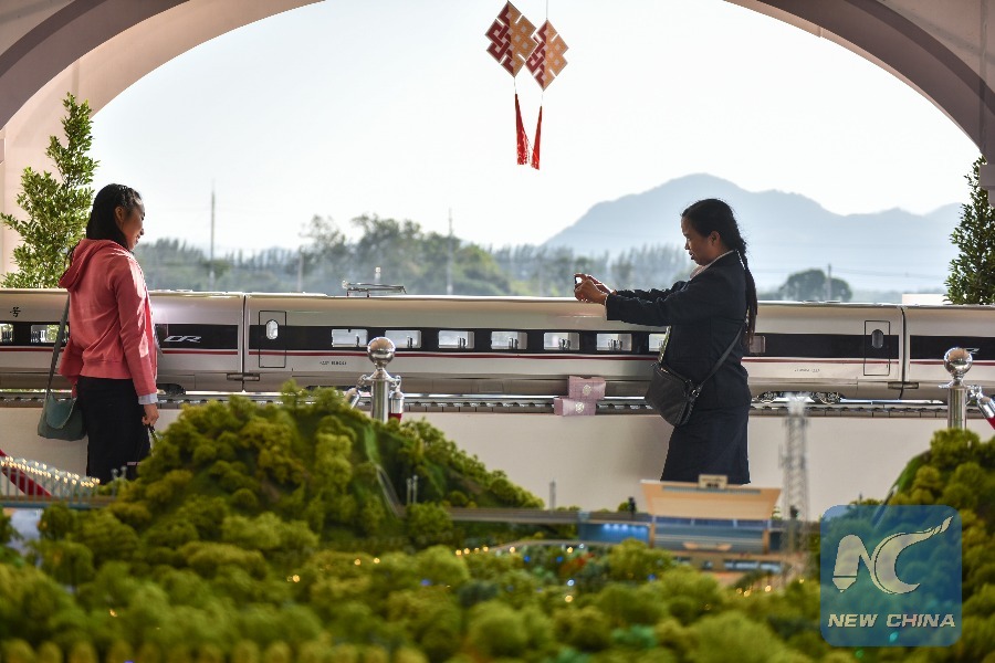 Visitors pose for photos with a model of the Chinese high-speed Fuxing bullet train in Pak Chong, Thailand, Dec. 21, 2017. (Xinhua/Li Mangmang)