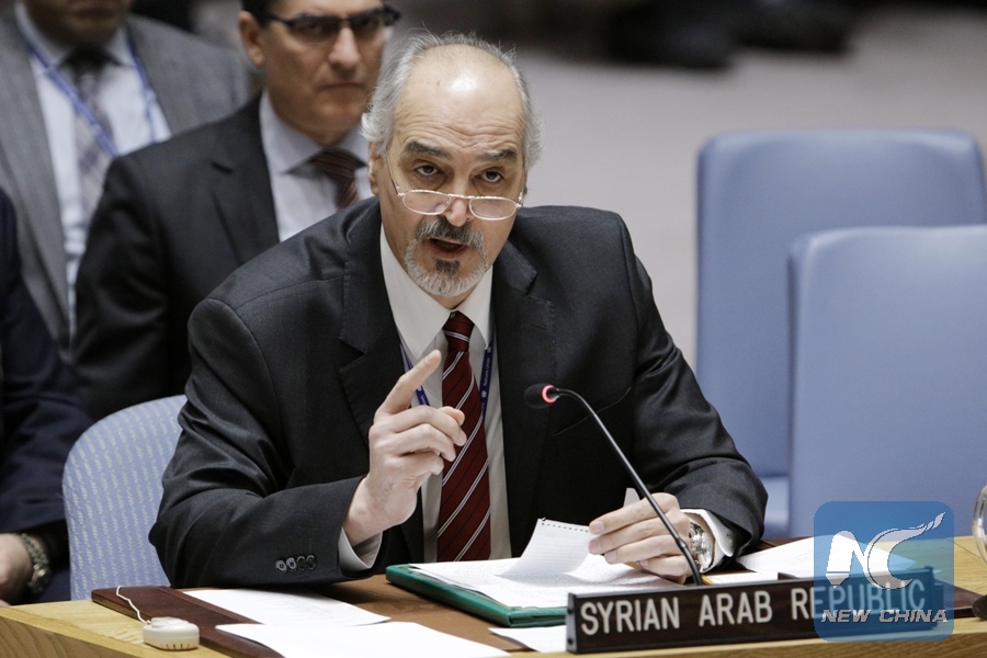 Syrian Ambassador to the United Nations Bashar Ja'afari (front) addresses a United Nations Security Council meeting on the humanitarian situation in Syria, at the UN headquarters in New York, March 27, 2018. (Xinhua/Li Muzi)