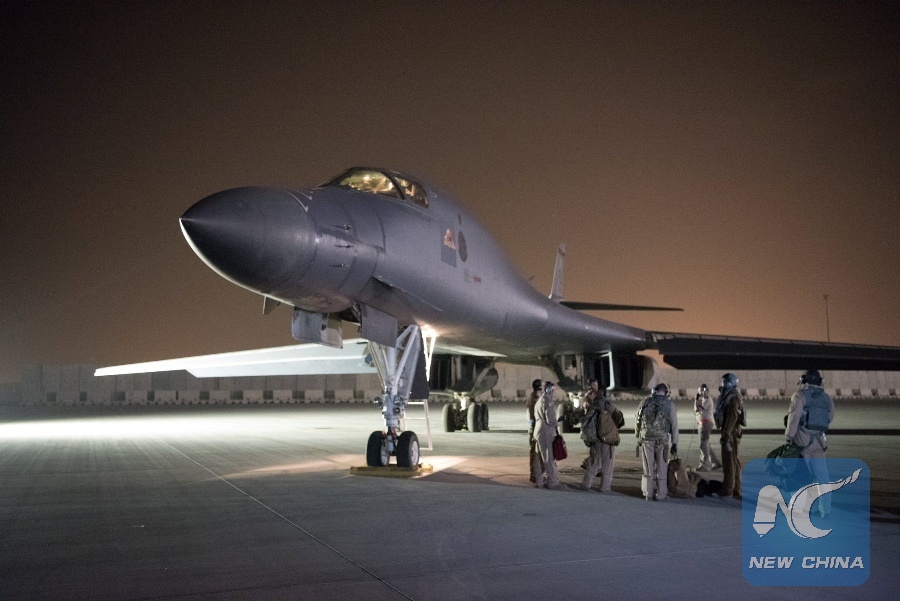 A U.S. Air Force B-1B Lancer and crew, being deployed to launch strike as part of the multinational response to alleged Syria's use of chemical weapons, is seen in this image released from Al Udeid Air Base, Doha, Qatar on April 14, 2018. U.S. Air Force/Handout via REUTERS.