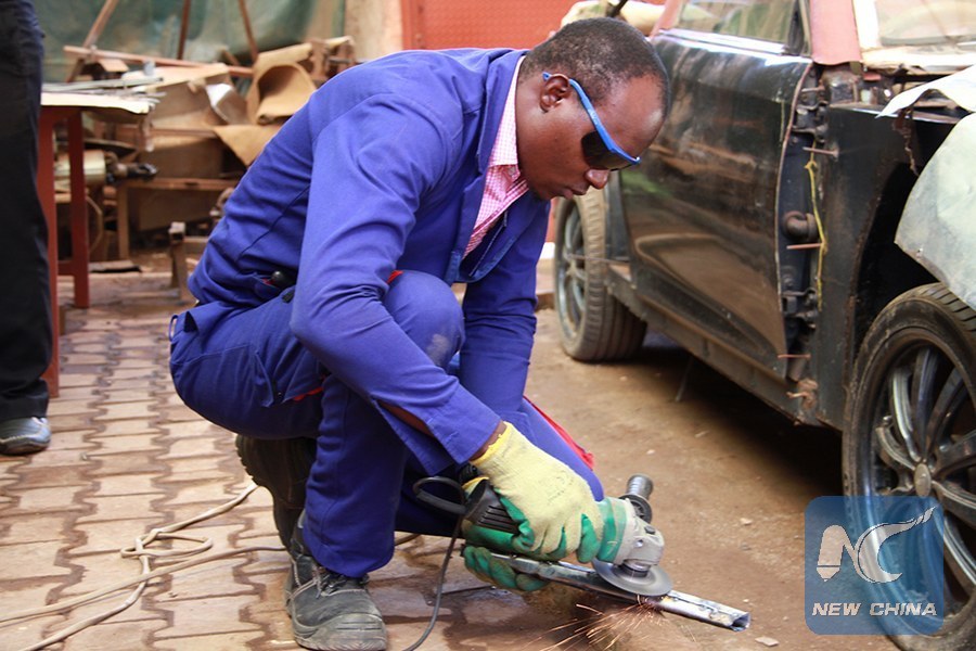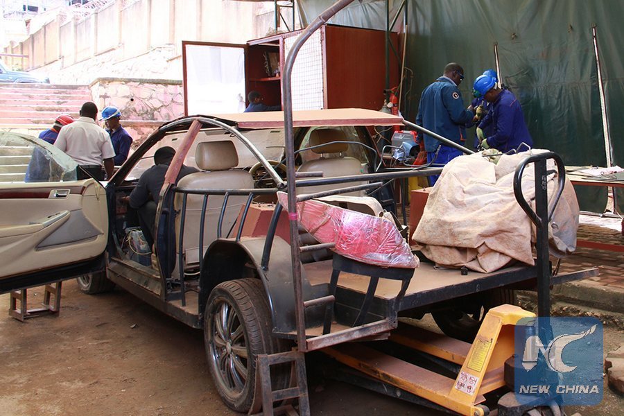 Workers assemble a hybrid vehicle at a factory of Kiira Motors Corporation (KMC) in the capital Kampala, Uganda (Xinhua/Zhang Gaiping)