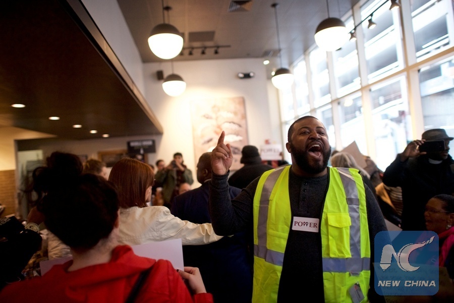 Interfaith clergy leaders stage a sit-in in a Center City Starbucks, near the location where two black men were arrested, in Philadelphia, Pennsylvania U.S. April 16, 2018. (Xinhua/REUTERS)