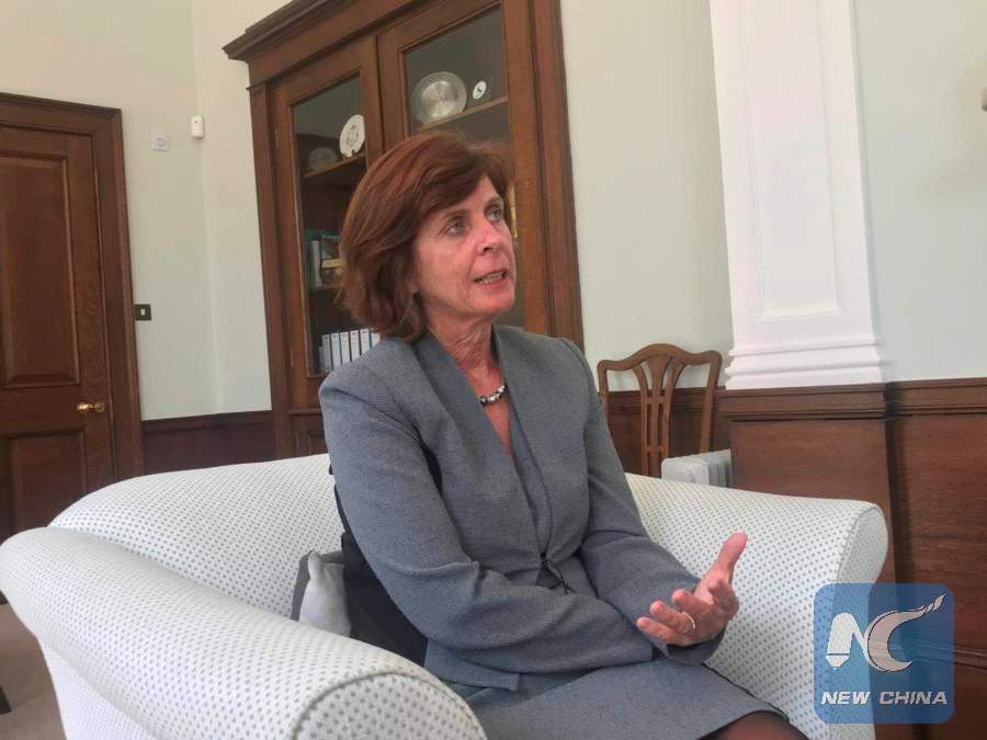 Oxford vice chancellor Louise Richardson is in an interview with Xinhua on April 3. (Xinhua/Gu Zhenqiu)