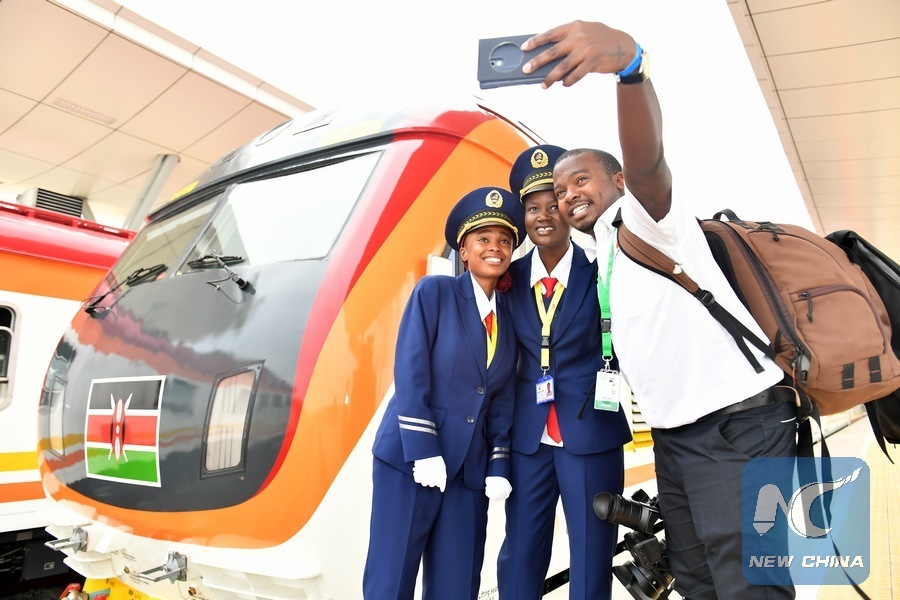 File photo taken on May 31, 2017 shows a Kenyan journalist takes a selfie with female train drivers Concilia (C) and Alice (L) during the launching day of the Mombasa-Nairobi Railway in Mombasa, Kenya. (Xinhua/Sun Ruibo)