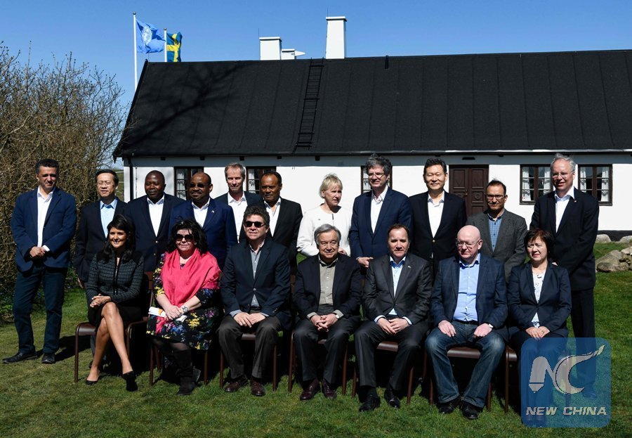 Members of the United Nations Security Council pose for a group photo during the annual informal working meeting with the UN Security Council on April 21, 2018 at Dag Hammarskjold's farm at Backakra, close to Ystad, southern Sweden. (Seated LtoR) U.S. Nikki Haley, Britain's Karen Pierce, Peru's Gustavo Meza Cuadra, United Nations Secretary-General Antonio Guterres, Sweden's Olof Skoog and Russia's Vassily Nebenzia. (Xinhua/AFP)