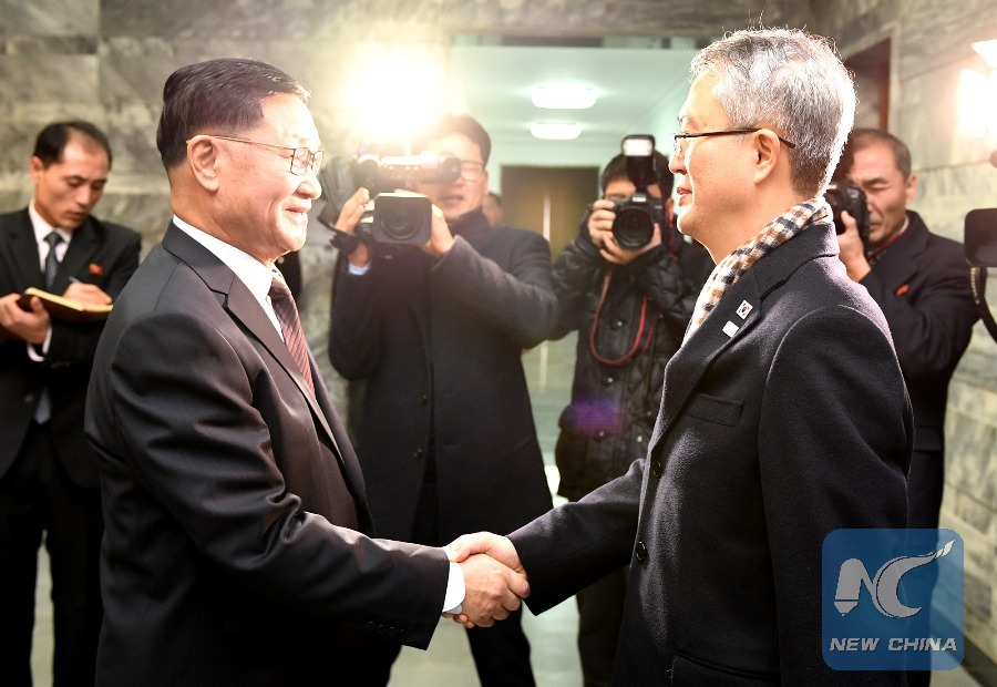 Lee Woo-sung(front, R), head of South Korean delegation, shakes hands with Kwon Hook Bong(front, L), head of the Democratic People's Republic of Korea (DPRK) delegation, at the truce village of Panmunjom, Jan. 15, 2018. (Xinhua)
