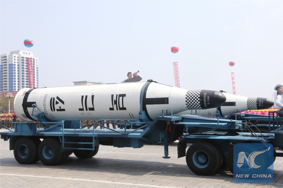 A submarine-launched ballistic missile is displayed during a military parade in central Pyongyang, April 15, 2017. The Democratic People's Republic of Korea (DPRK) showcased its military muscles by parading all of its most-advanced ballistic and tactic missiles, including a submarine-launched ballistic missile which could strike targets 1000 km away. (Xinhua/Zhu Longchuan)
